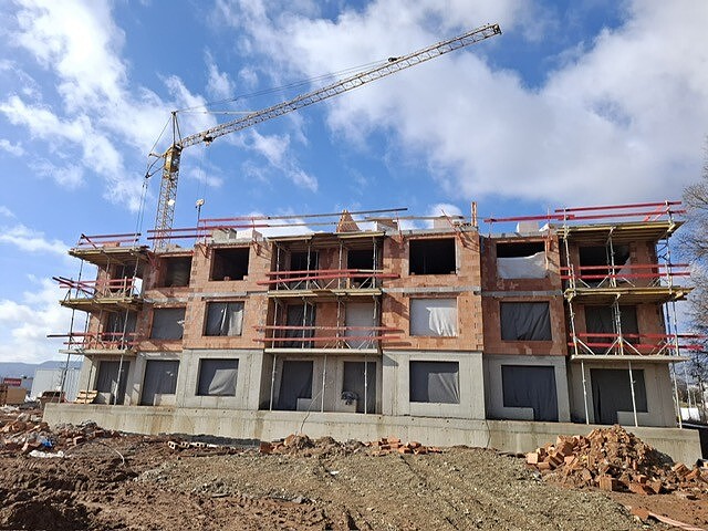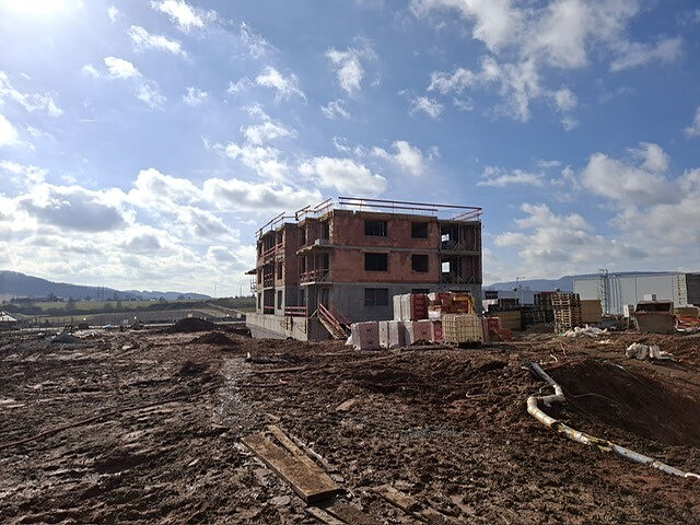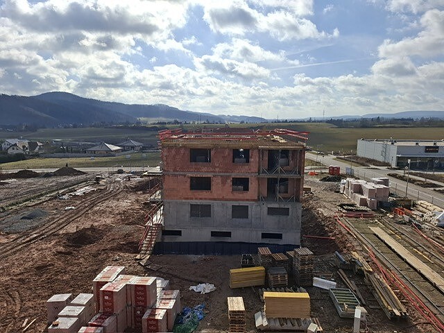Výstavba bytových domů U KOMÍNA pokračuje podle stanoveného harmonogramu a stavba doslova nabírá na objemu každým týdnem. Aktuálně probíhá realizace hrubé stavby – dokončuje se zdění nosných konstrukcí jednotlivých podlaží a souběžně probíhá pokládka prefabrikovaných stropních panelů. Díky plynulé koordinaci všech profesí postupují práce systematicky a bez zdržení. S každým dalším dnem je už nyní patrné budoucí dispoziční řešení bytů i celková hmota objektu. Projekt tak získává své reálné obrysy a potvrzuje, že nová etapa bydlení v této lokalitě se úspěšně posouvá do další fáze výstavby.