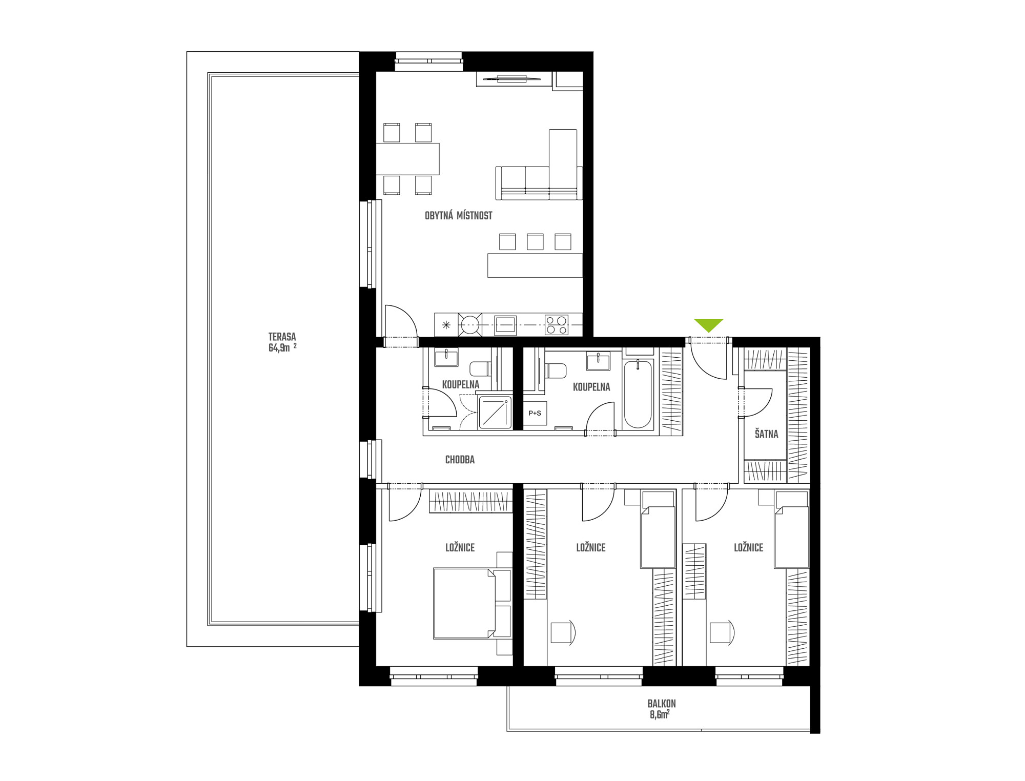 K bytu je možno přikoupit garážové stání přímo pod domem.